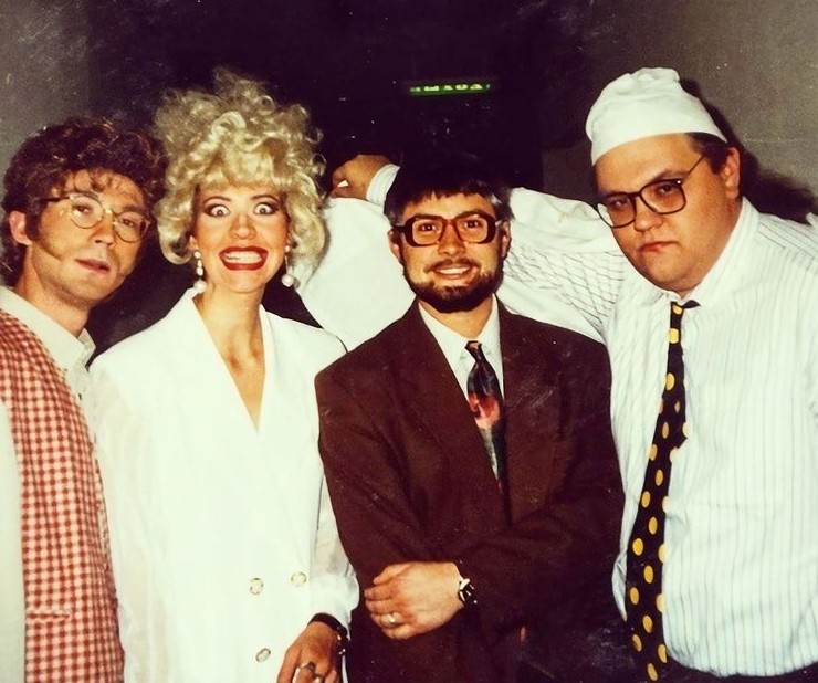 Участники телевизионного шоу «О.С.П.-студия» Павел Кабанов, Татьяна Лазарева, Сергей Белоголовцев и Сергей Сивохо, середина 90-х