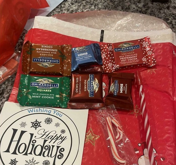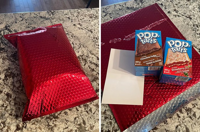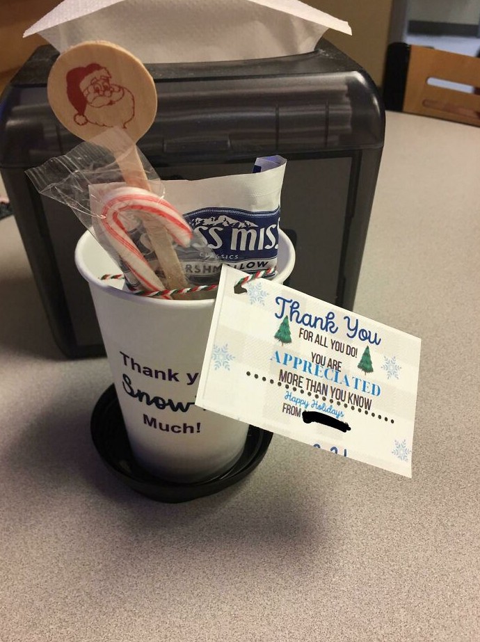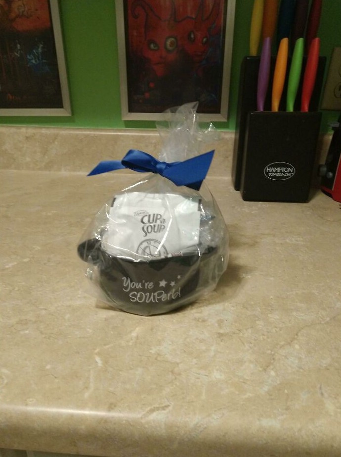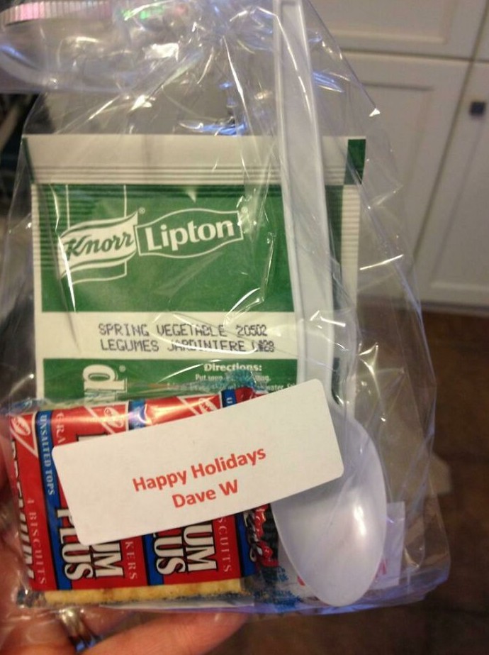 «Моя рождественская премия. Да, это суп в пакетиках. Но к этому ещё прилагалась чашка и бантик, так что, вы знаете, все просто отлично»
