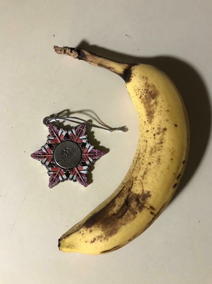 Ёлочная игрушка с логотипом компании в благодарность за усердную работу (банан для масштаба)