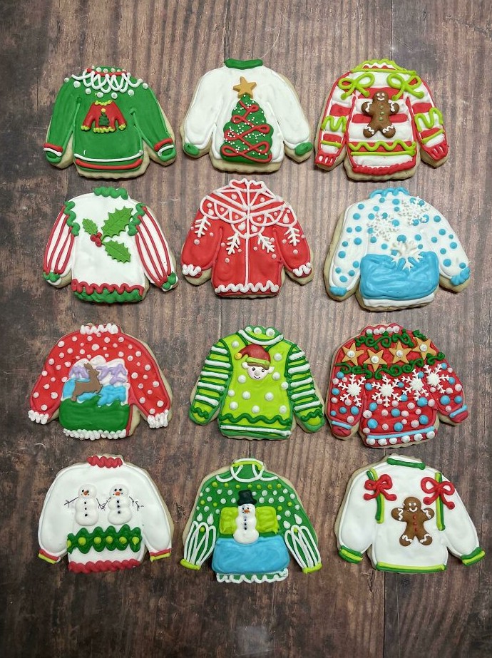 Печенья в виде свитеров с соответствующими рисунками из глазури