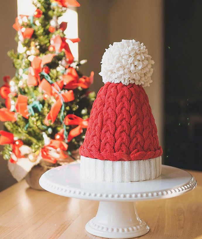 Домашний праздничный торт, сделанный в виде вязаной шапки с бубоном