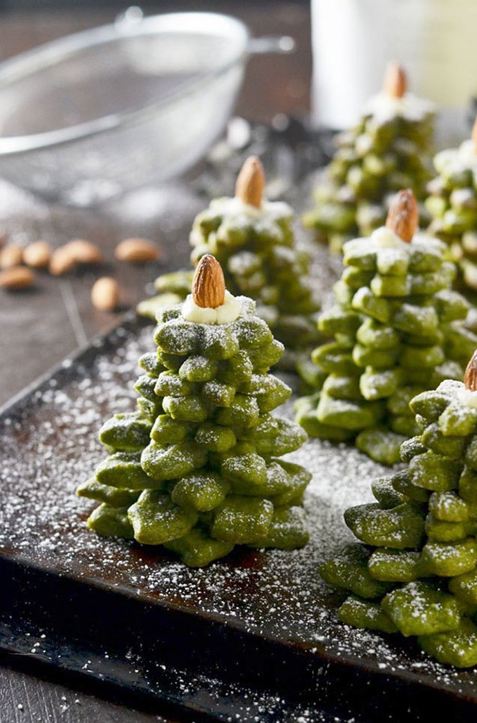 Сложенное в виде ёлочки песочное печенье (в данном случае из матча), посыпанное сахарной пудрой и украшенное миндалём
