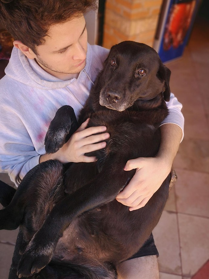 «Это Афина, 9-летний лабрадор. Она пухленькая, но ревнует, когда видит, как наши маленькие собаки сидя у нас на коленях, и закатывает истерику... Так что, конечно, я поддаюсь ее капризам»