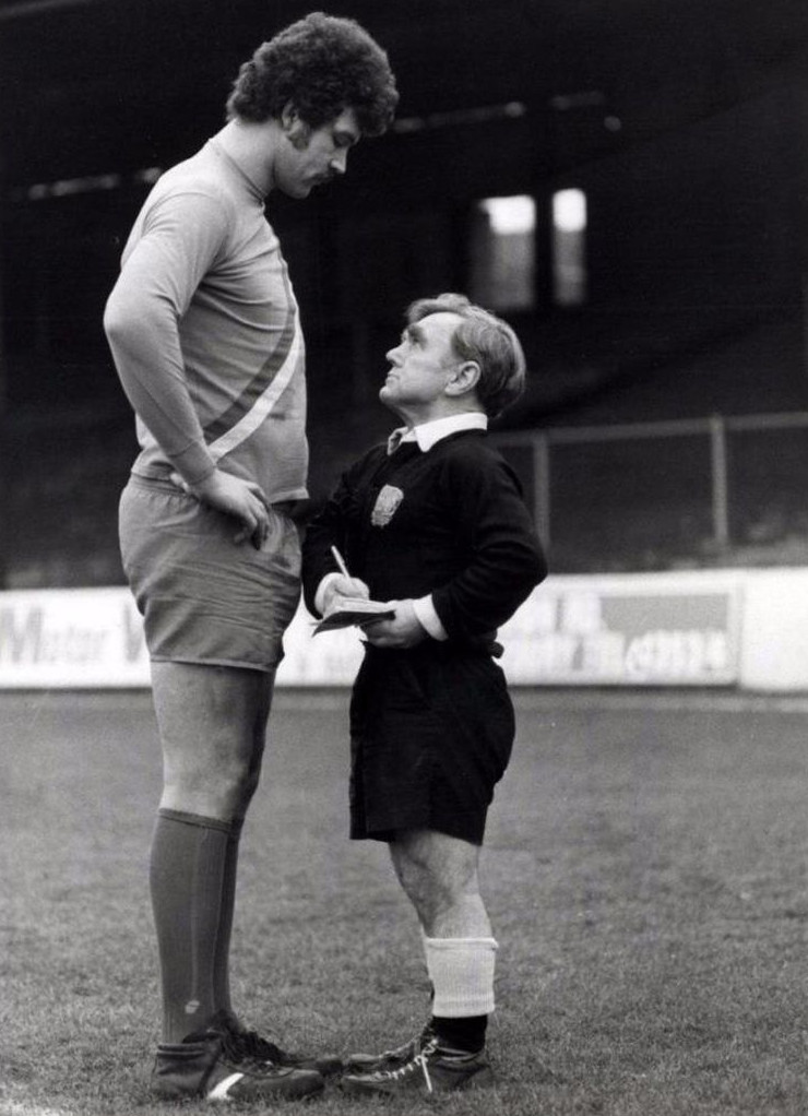 Арбитр Джоуи Шаклфорд (рост 1,46 м) выносит предупреждение Клайву Годдарду (рост 2,06 м), Англия, 1980 год