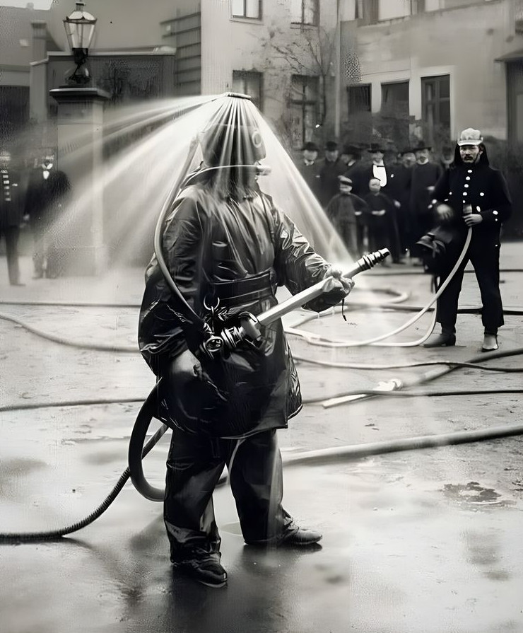 Публичная демонстрация пожарного шлема с водяным душем компании König в Гамбурге, Германия, 1900 год