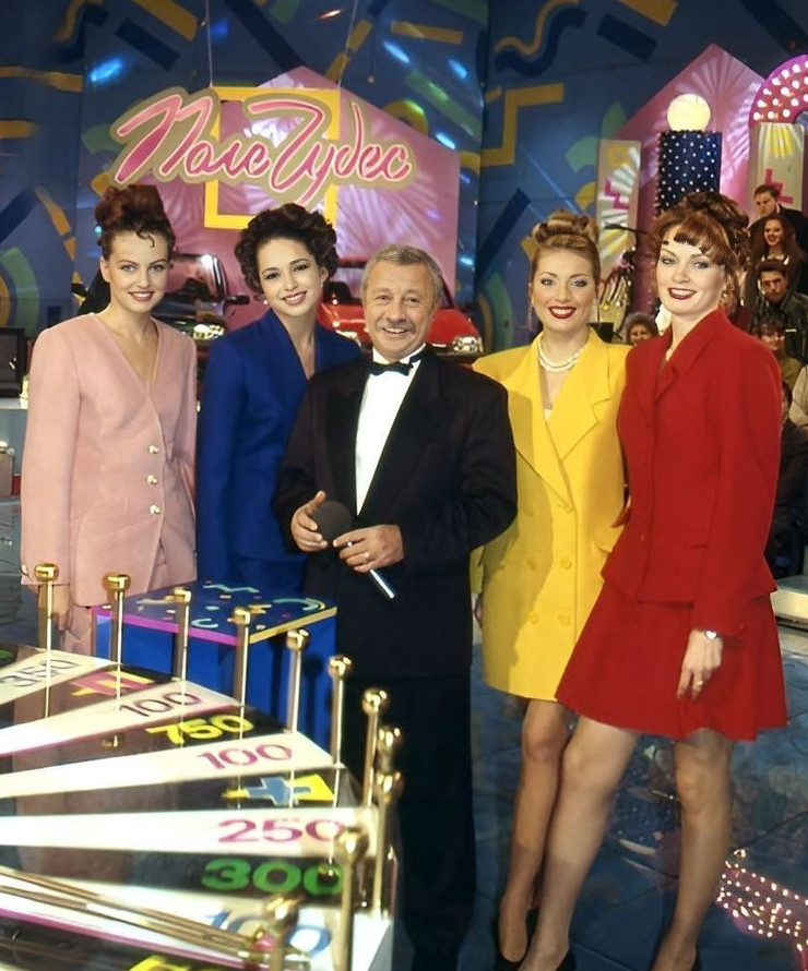 Леонид Якубович с девушками на съёмках капитал-шоу «Поле чудес». Москва, 1996 год