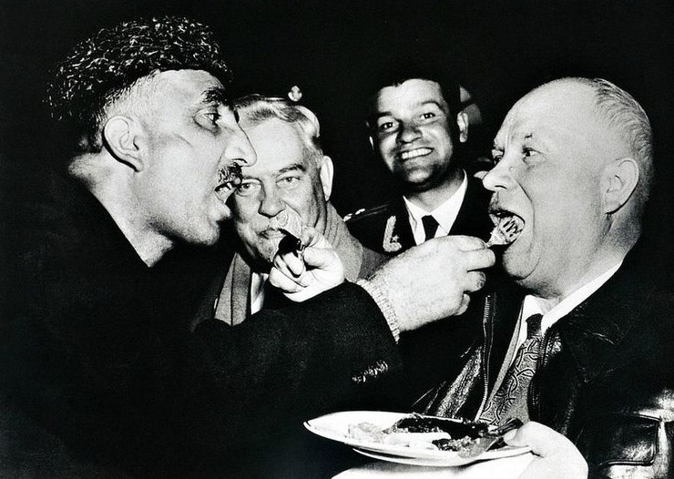 Бывший Премьер-министр Джамму и Кашмира Бакши Гулам Мохаммад и Никита Хрущев во время визита в Индию в 1955 году. Взаимное кормление — кашмирский обычай гостеприимства