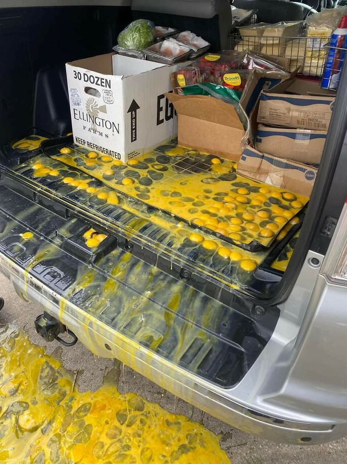 Во время перевозки ведра треснувших яиц, человек, который загружал их в автомобиль, сильно напортачил