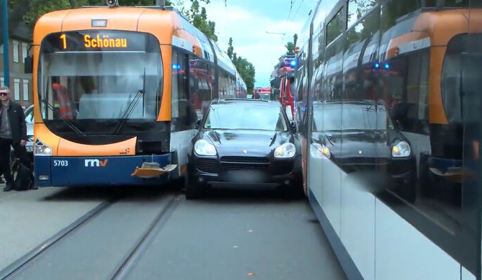 Водитель Porsche пытался проехать мимо трамвая и застрял между двумя поездами