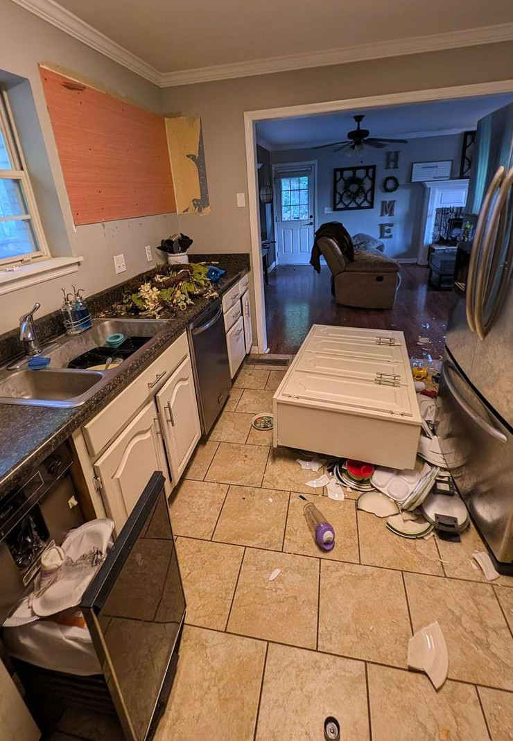«Почему-то его падение не разбудило никого в доме. Моя жена и двое детей (2 и 10 лет) проспали всю ночь. Я пришел с ночной смены и увидел кухню в таком виде», — написал автор фото.
