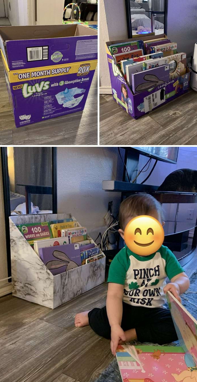 «Переделала старую коробку под подгузники в книжный шкаф для сына»