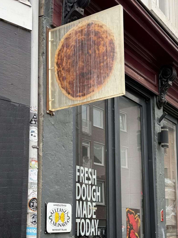 Эта вывеска пиццерии представляет собой настоящую пиццу, покрытую акрилом