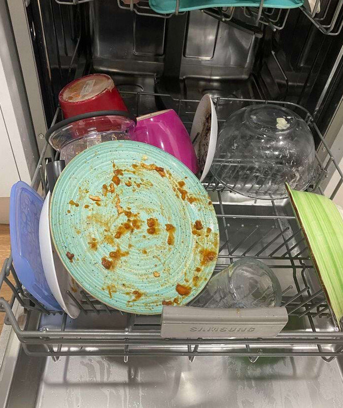 Некоторые люди действительно верят, что можно не выбрасывать твёрдые кусочки пищи с тарелок в мусорку перед загрузкой их в посудомоечную машину. Тем более подобное помещение тарелки сделает мытьё других неэффективным 🧽