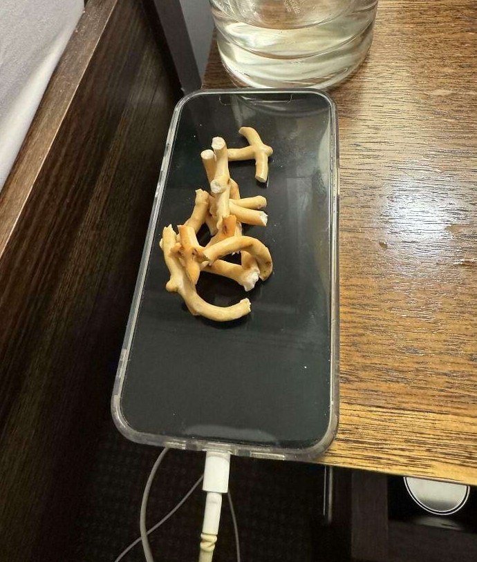 Она буквально использует свой телефон в качестве тарелки для размокших остатков крендельков. В качестве достойной замены пользователи предложили купить ей просто соль.