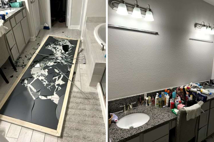 «Это зеркало было около 3 метров в длину и досталось нам вместе с домом, когда мы его купили. Я думал, кто-то разбил наше окно в ванной и ломится внутрь, или стекло в душевой кабине разбилось… Прошло 2 часа, а я все еще убираю стекла с пола», — написал автор фото.
