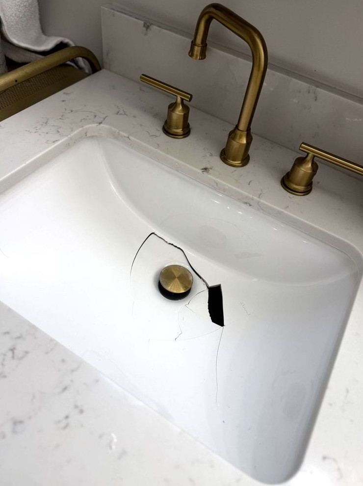 Флаконы духов могут быть очень увесистыми, но на фото также видно, что и дно раковины довольно тонкое и хрупкое. Автор сообщил, что при этом флакон духов уцелел.