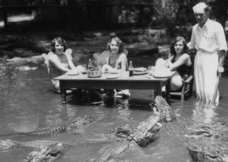 Пикник на ферме аллигаторов в Лос-Анджелесе, где посетителям разрешалось свободно общаться с дрессированными аллигаторами, около 1920-х годов