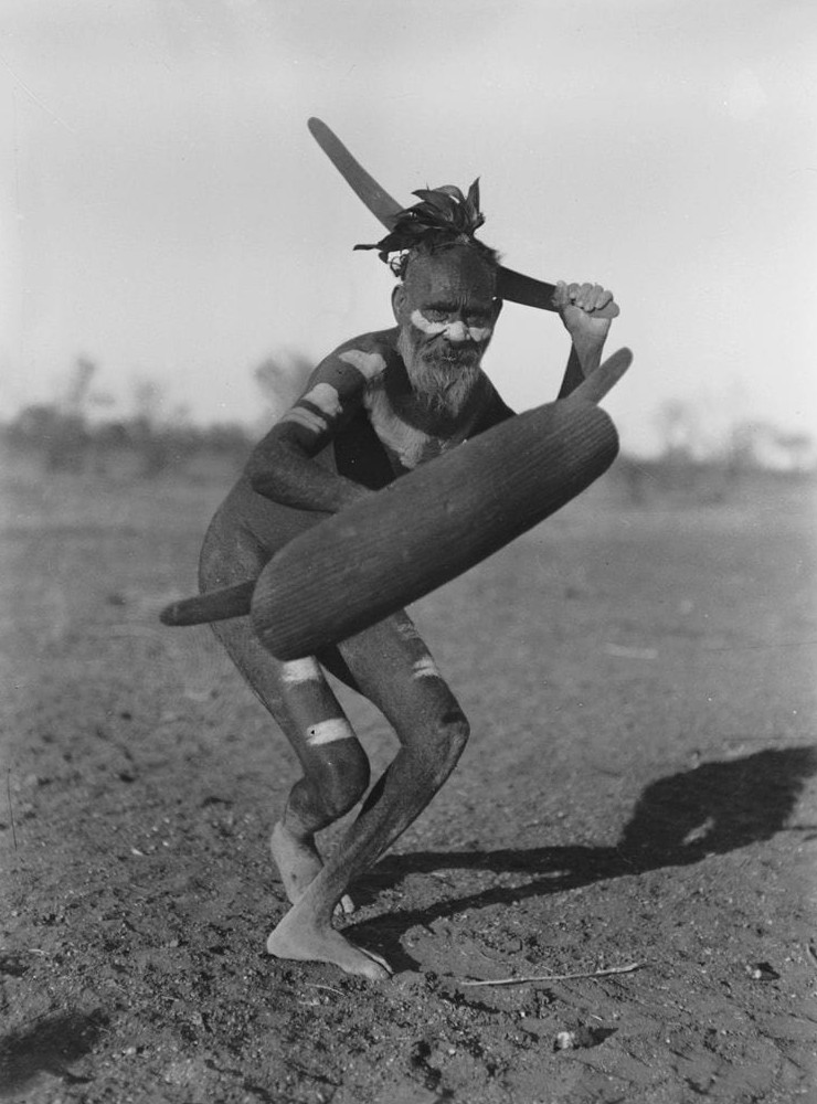 Мужчина племени луритья показывает атаку со щитом и бумерангом. Центральная Австралия, 1920 год