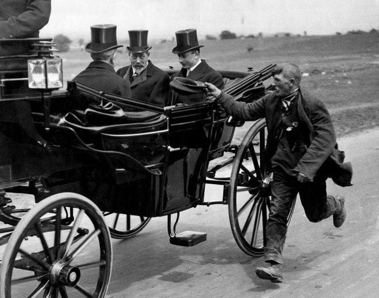 Нищий догоняет карету короля Георга V, Лондон, 1920 год