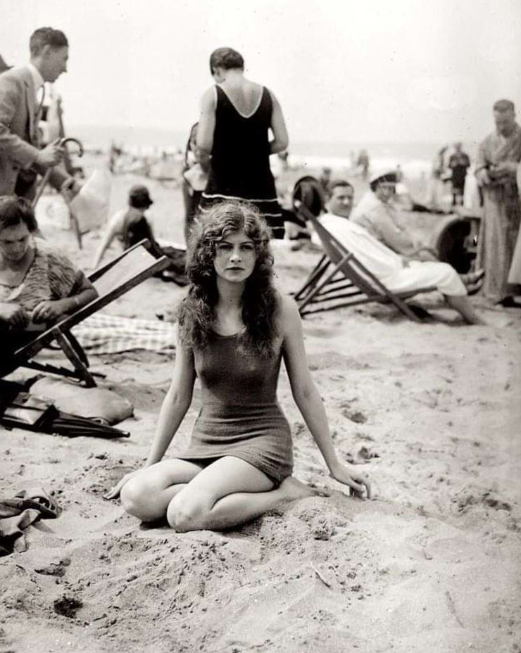 Молодая леди наслаждается днём на пляже, Франция, около 1920 года