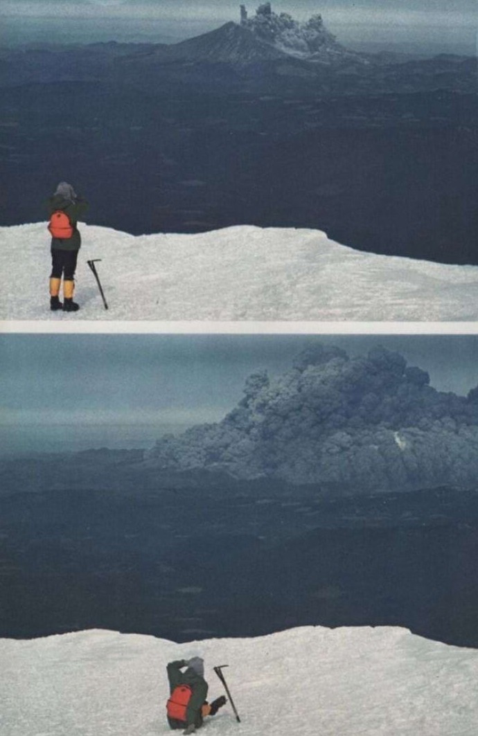 Фотография туриста, наблюдающего за извержением вулкана Сент-Хеленс с горы Адамс