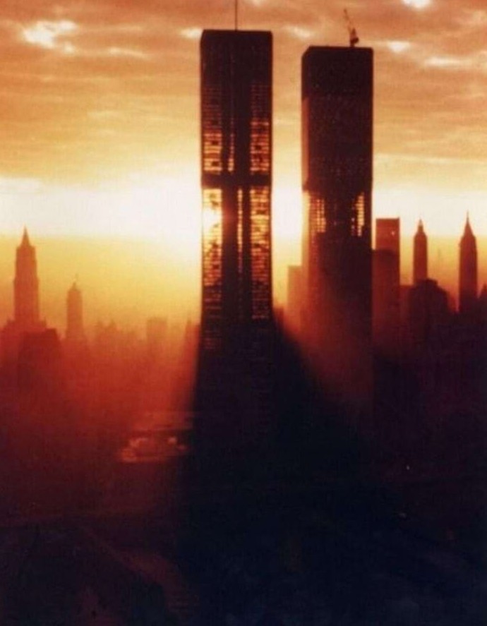 Башни-близнецы сразу после строительства, демонстрирующие свою революционную почти пустотелую архитектуру