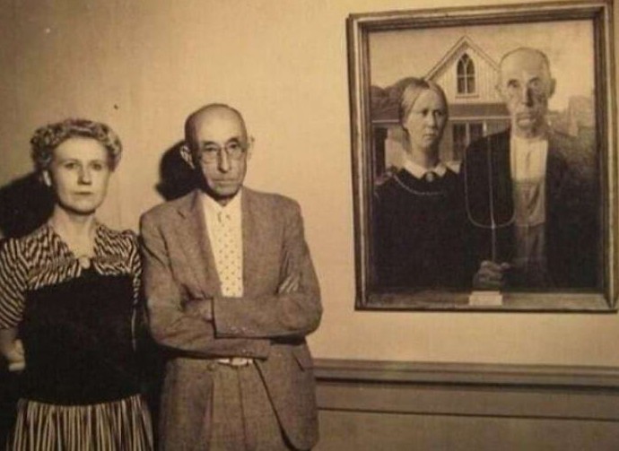 Реальные модели рядом с картиной «Американская готика»