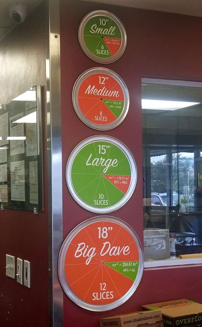 Эта пиццерия демонстрирует размеры пицц и насколько они велики по сравнению друг с другом