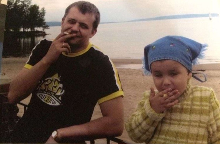 «Моя сестра и двоюродный дядя на перекуре. У сестры сигарета марки "картошка фри"»