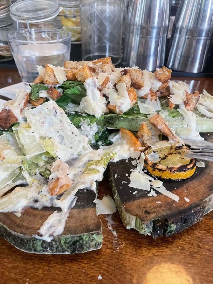 «Мой салат Цезарь на куске дерева с большой трещиной»