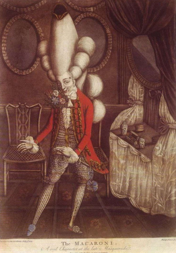В XVIII веке в Британии появились так называемые «макарони» — молодые аристократы, которые щеголяли в огромных париках, с миниатюрными шляпками и перьями на макушке.