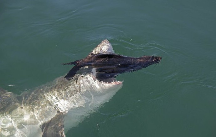 16. Большая белая акула готова наброситься на неосторожного тюленя