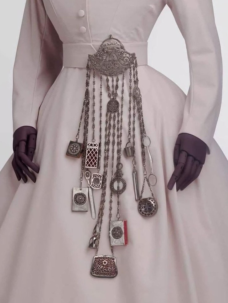 11. Классический шатлен, 1863–1885 гг. Содержимое: ножницы, флакон духов, игольник, наперсток, футляры для мелочей, нож для писем, пинцет, резак для сигар, лупа, небольшой блокнот для письма