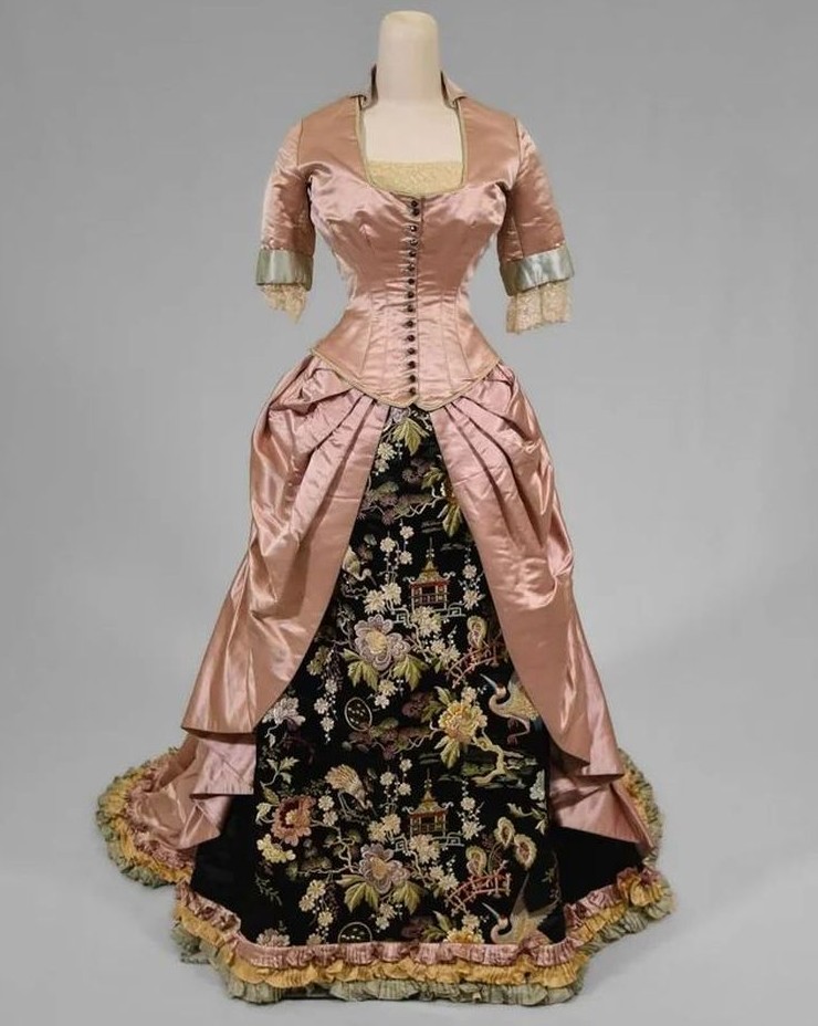 12. Платье Элеоноры Белкнап Куорриер из розового шелка с декоративной передней отделкой из контрастного черного шелка, вышитой азиатскими мотивами, такими как пагоды, цветущая вишня и журавли, что вызывает в памяти образ японских гравюр, популярных в 1860–1870-е годы, 1875 год