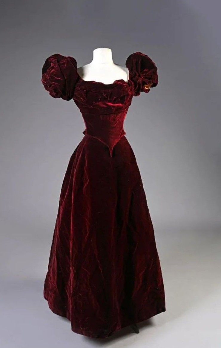 13. Бальное платье из малинового шелкового бархата, около 1900 г.