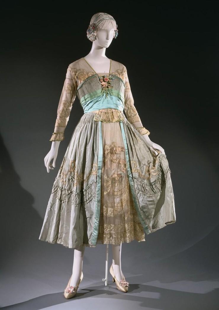 15. Вечернее платье, созданное Люсиль в стиле XVIII века, из шёлковой тафты, атласа, тюля и шифона, с кружевом, кружевными вставками и аппликациями, лентами и шёлковыми цветами, 1916 год