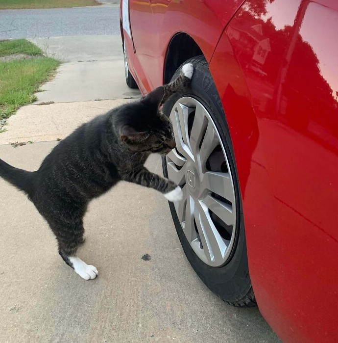 2. Котик проверяет колеса и тормоза, чтобы избежать китти-строфой на дороге