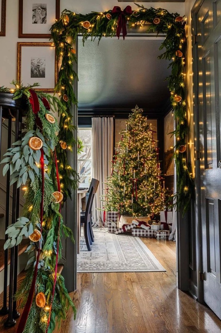Если в квартире есть арки или широкие дверные проёмы, их можно украсить гирляндами, хвойными ветками или лентами. Это создаёт ощущение цельного, продуманного декора во всей квартире.