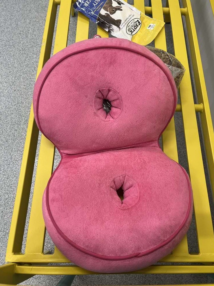 В комментариях писали, что некоторые вставляют в отверстия лапы собак во время стрижки когтей. Может поэтому данную подушку передали в приют для животных
