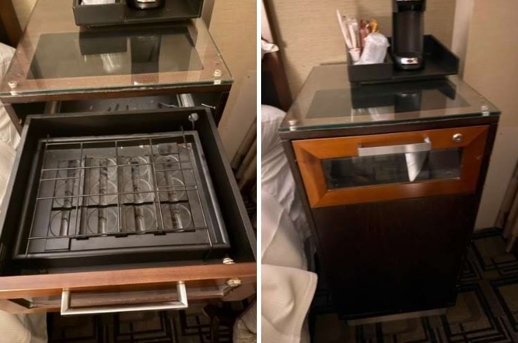 Ответ: «Раньше там хранились платные напитки. Эта полка с датчиком веса, чтобы сразу можно было понять, брали ли вы что-нибудь оттуда».
