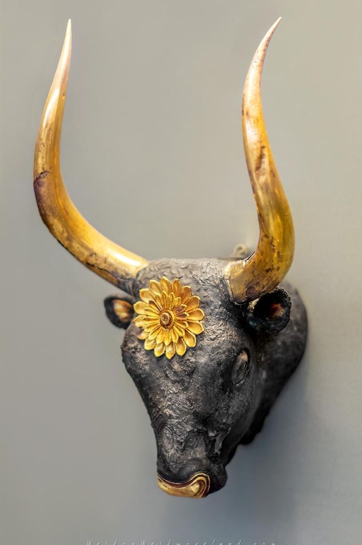 11. Микенский ритон в виде головы быка. Сочетание серебра в качестве основного элемента и золотого декора свидетельствует о высочайшем мастерстве металлурга. Датируется примерно 1525 годом до н.э.