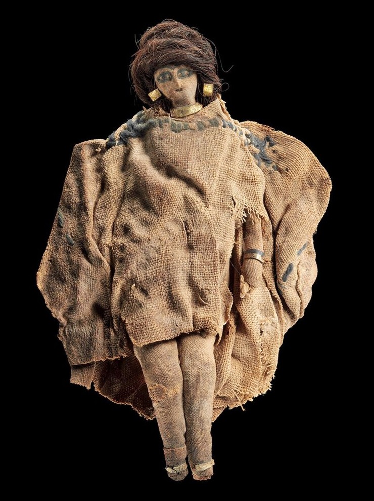 16. Текстильная кукла из римского Египта, ок. 100-200 гг. н.э.: эта кукла украшена настоящими человеческими волосами, золотыми украшениями, позолоченными кожаными манжетами и вышитым льном