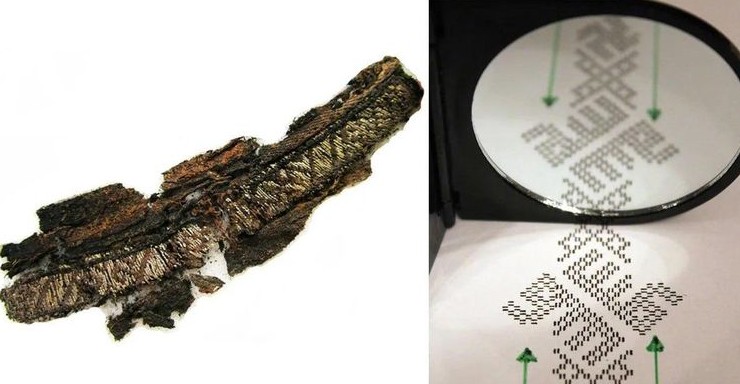 17. Погребальная одежда эпохи викингов, на которой имя «Али» повторяется несколько раз рядом с именем «Аллах». Обнаруженная в захоронениях викингов в Гамле-Упсале в Швеции, эта одежда украшена узорами, сотканными из шелковых и серебряных нитей, причем оба имени написаны зеркально отраженными буквами