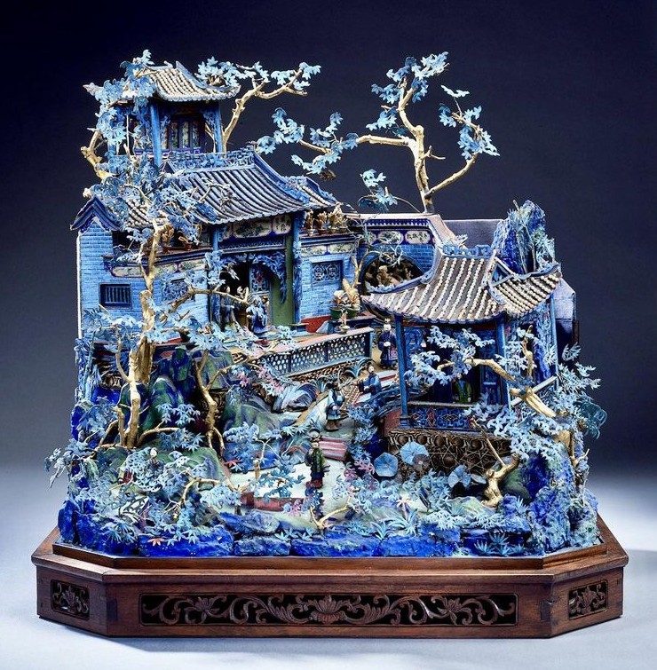 6. Миниатюрная модель китайского сада, раскрашенная голубыми перьями зимородка, называемая Тяньцуй (усеянная перьями зимородка) — стиль китайского искусства династии Цин, XIX век