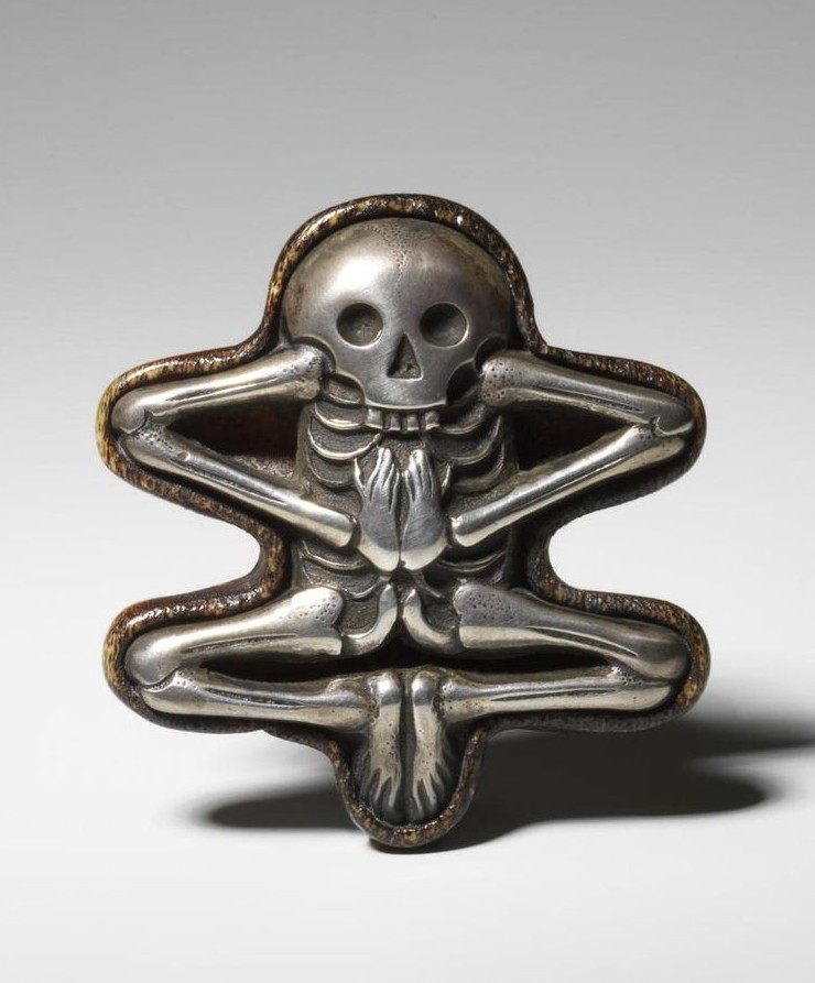 8. Нэцке конца XIX века, изображающее медитирующий скелет, выполнено из серебра и вставлено в олений рог. Период Мэйдзи, Япония, в настоящее время хранится в Британском музее