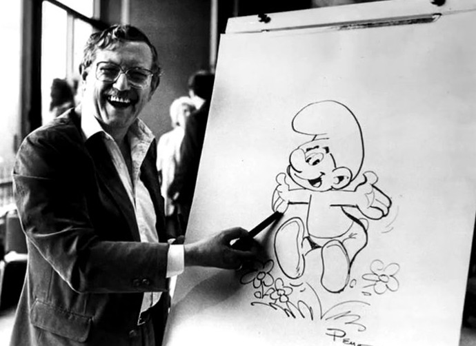 2. Пьер Кюллифорд, создатель смурфиков, представляет свой законченный рисунок смурфа в студии в Брюсселе, Бельгия, 1983 год