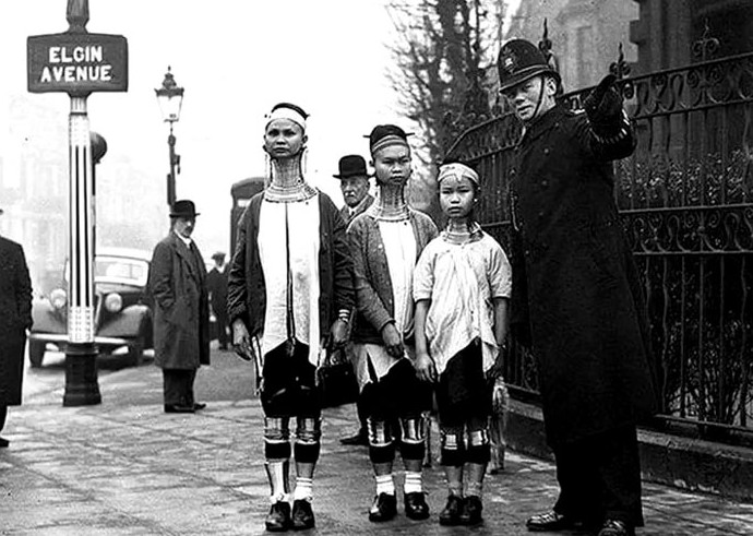 4. Женщины племени Падаунг спрашивают дорогу у лондонского полицейского, 1935 год