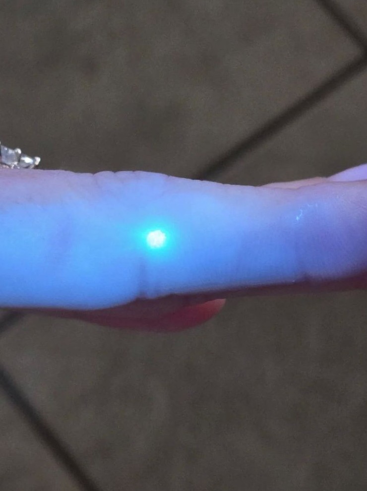 Автор фото написал, что имеет в виду яркую круглую точку, уточнив что он светил на руку фонариком, а не лазером 🟢