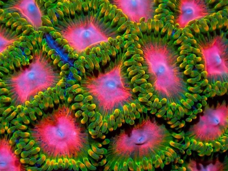 15. Макроснимок потрясающих цветущих зоантидов. Это красочные колониальные полипы, родственники кораллов и актиний, популярные в морских аквариумах
