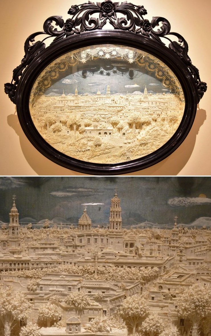 11. «Панорама города Селайя в Гуанахуато», вырезанная из сердцевины фигового дерева на шелке и гуаши, наклеенная на картон